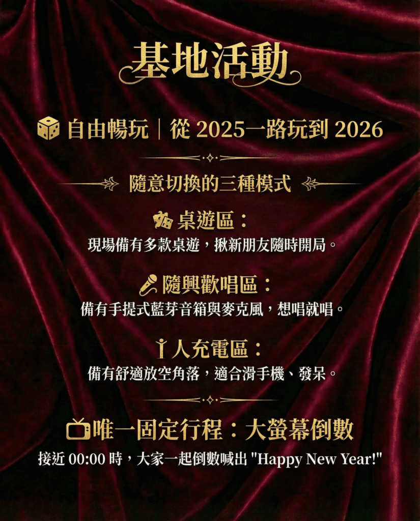 【台北中山】2026室內跨年基地|桌遊・聊天・倒數|2025陪你玩到 2026