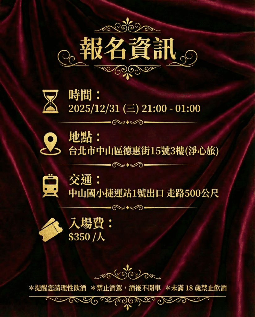 本場次主打「交流與放鬆」,請勿酗酒爛醉,保持舒適的交流氛圍。