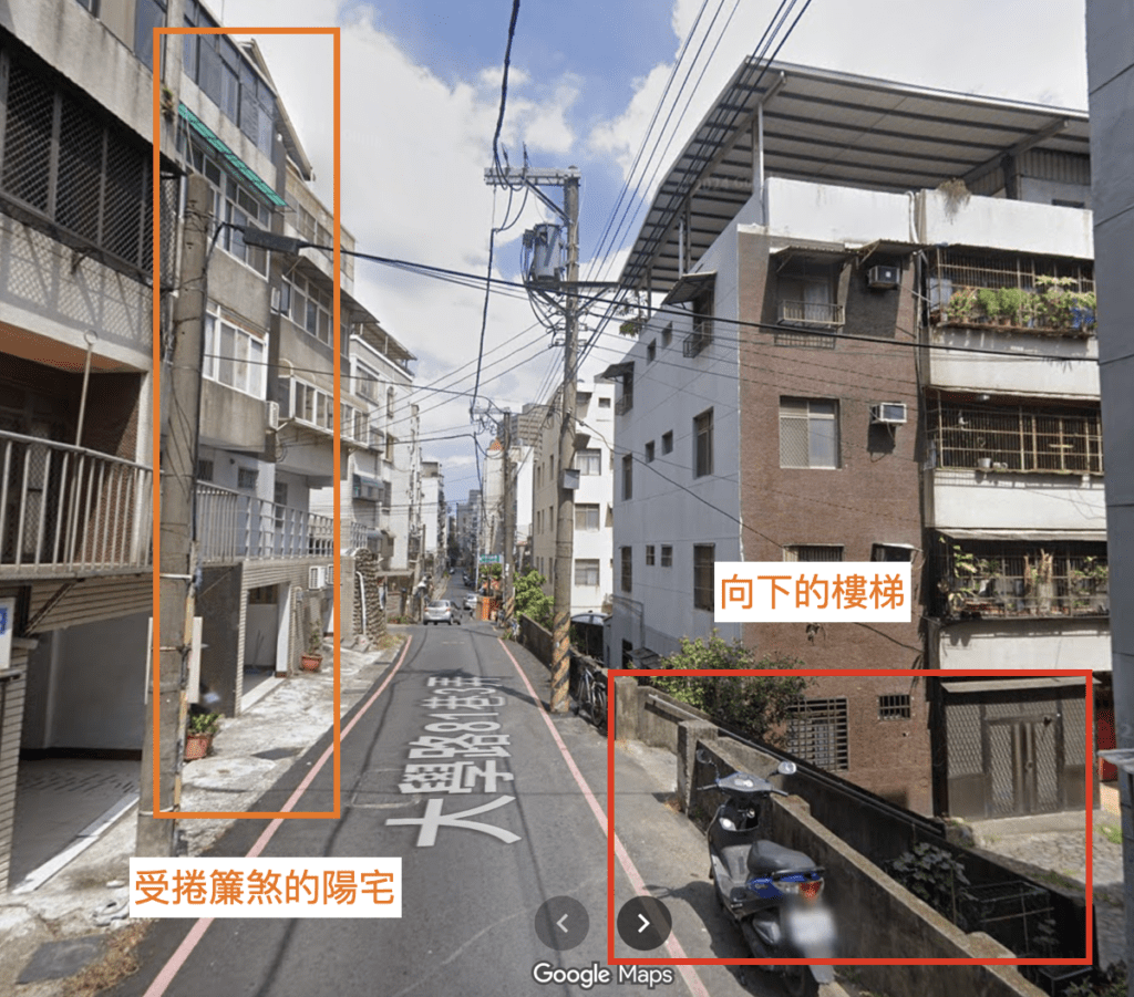 此外,在有高低落差的地區(如山坡地或丘陵),挑選房屋時要特別注意,陽宅正前方切勿直接面對向下的樓梯,否則同樣會構成此煞,如下圖: