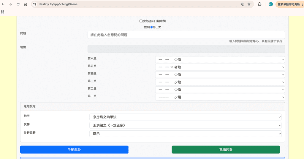 進入網站後,輸入你的起卦資訊。請注意輸入的方式是由下而上,第一次起的是第一爻,是最下面的爻;第六次起的是第六爻,是最上面的爻。輸入完後點選「手動起卦」。