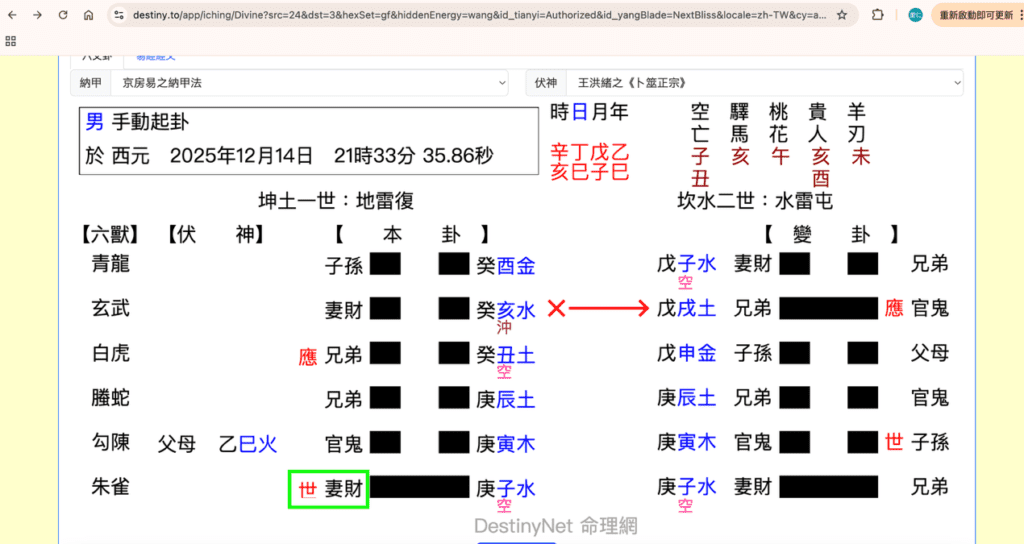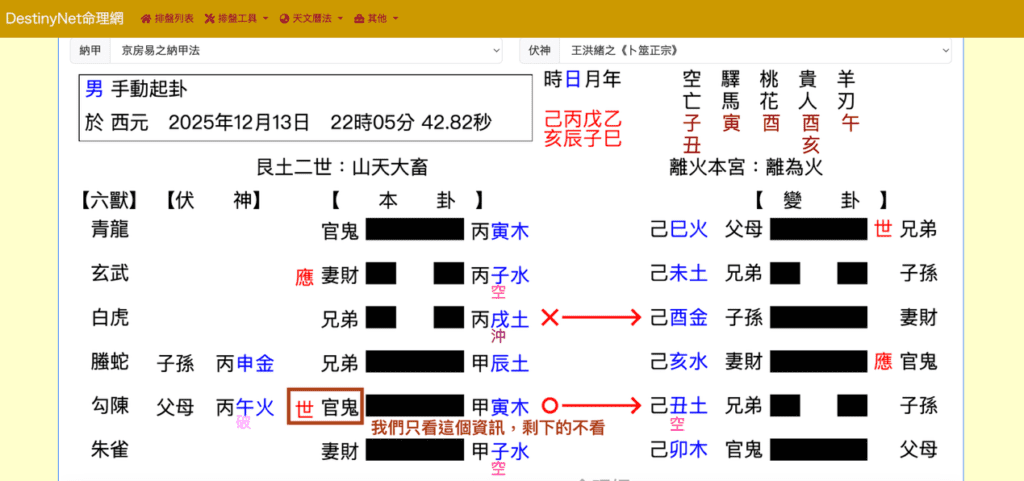 現在你取得一個卦盤了,卦盤上面有一堆你看不太懂的資訊。但這些都不重要,找到「本卦」中的「世」旁邊寫的是什麼就可以了。以下面這卦來說,「世」旁邊是「官鬼」,我們稱為「官鬼持世」或「世持官鬼」。